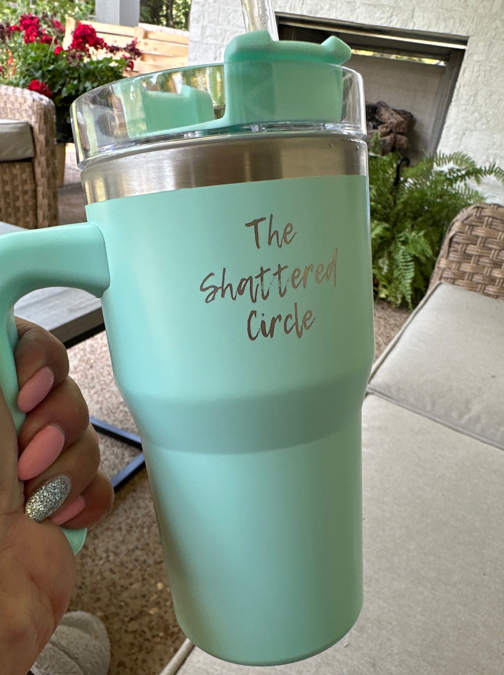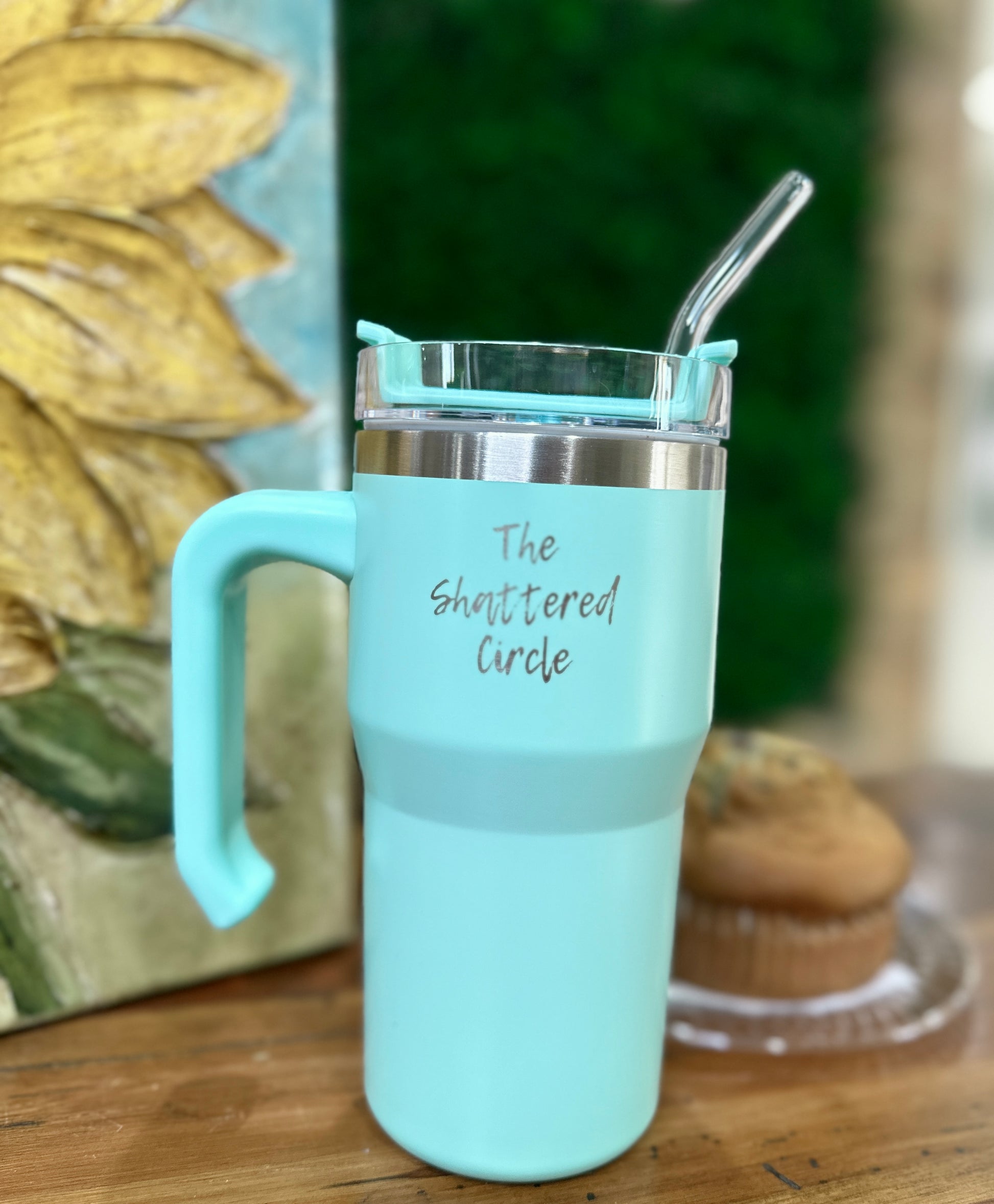 "The Shattered Circle" 20 oz teal green tumbler with handle, closable lid and glass straw