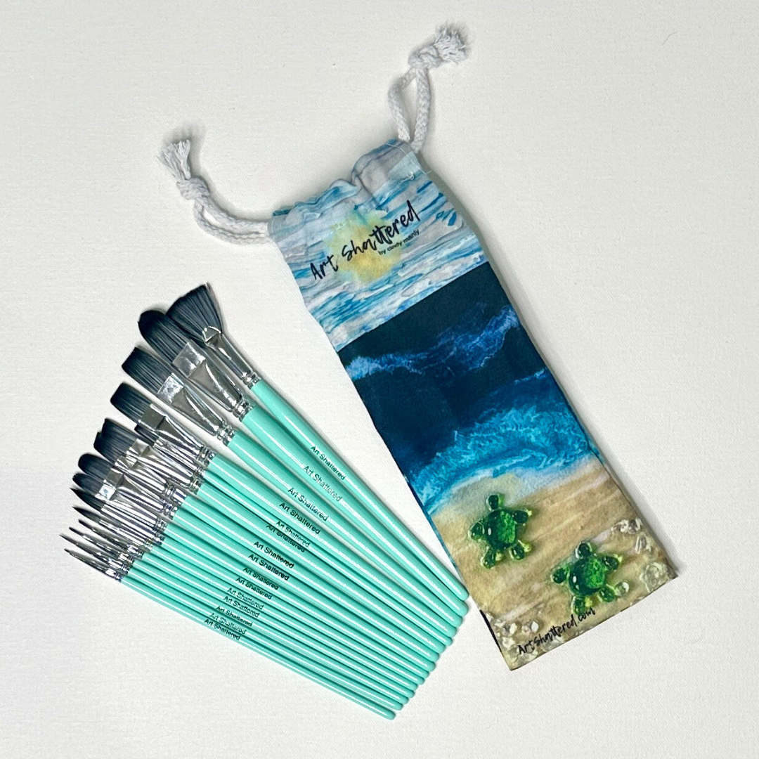 Our exclusive Art Shattered 15-Piece Brush Set comes with a beautifully designed custom drawstring bag, large enough to hold all your brushes and palette knives—ideal for both studio use and travel!