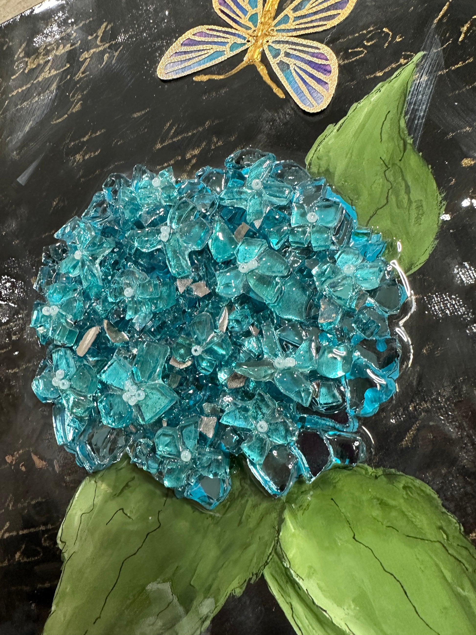 Bring the beauty of nature indoors with this breathtaking mixed media hydrangea artwork. The vibrant Blue hydrangea blooms are intricately crafted from sparkling crushed glass and adorned with delicate bead accents, creating a captivating 3D effect. A golden butterfly gracefully flutters nearby, adding a touch of elegance and whimsy to the scene.