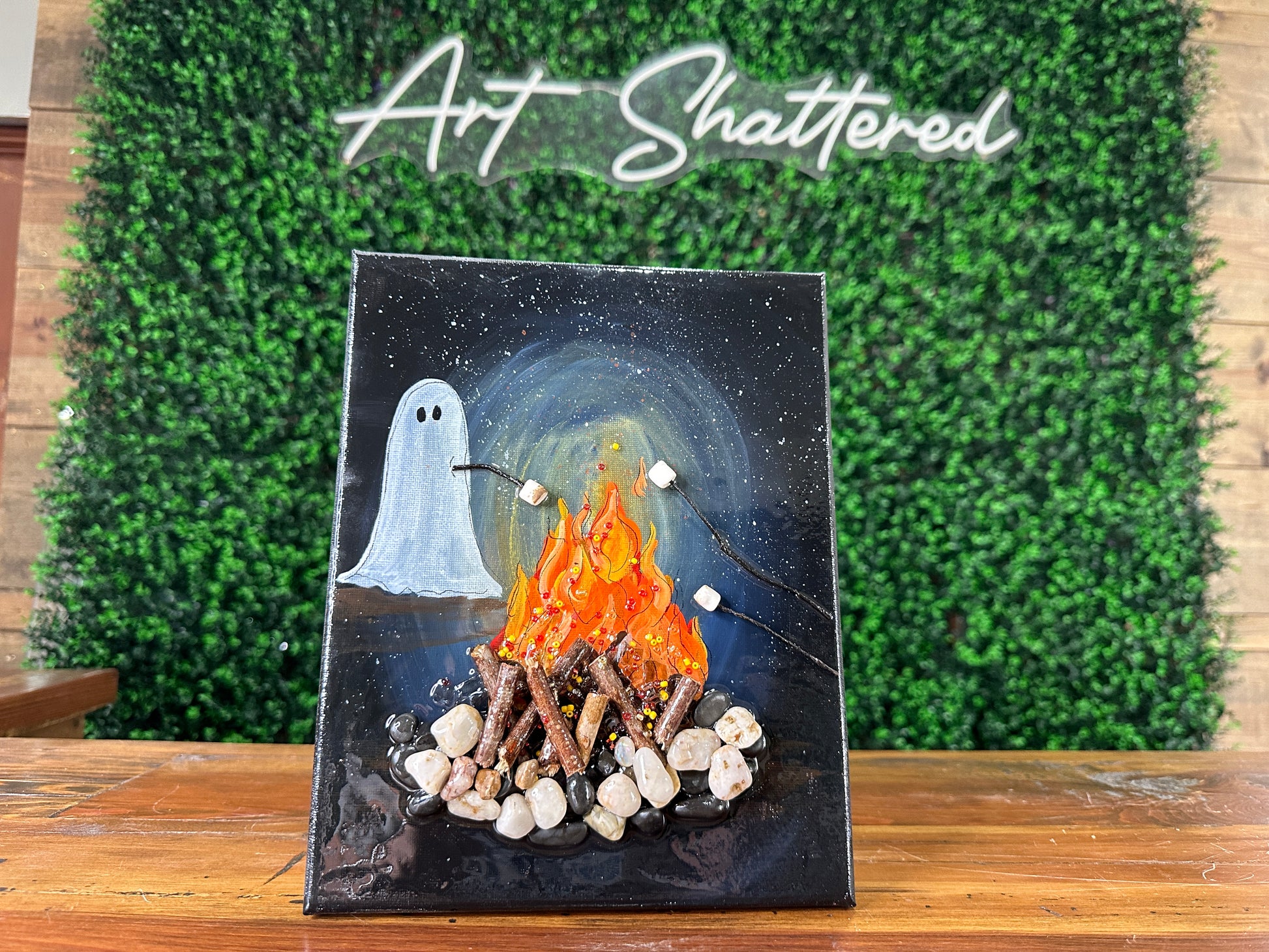 Gather around this spooky and charming campfire scene that captures the eerie yet cozy essence of a haunted night under the stars. This mixed media piece is brought to life with realistic stick logs, polished stones, shimmering crushed glass, and fiery beads that create a flickering flame effect. Hand-sculpted mini marshmallows roast over the glowing fire, adding a touch of nostalgia and fun.