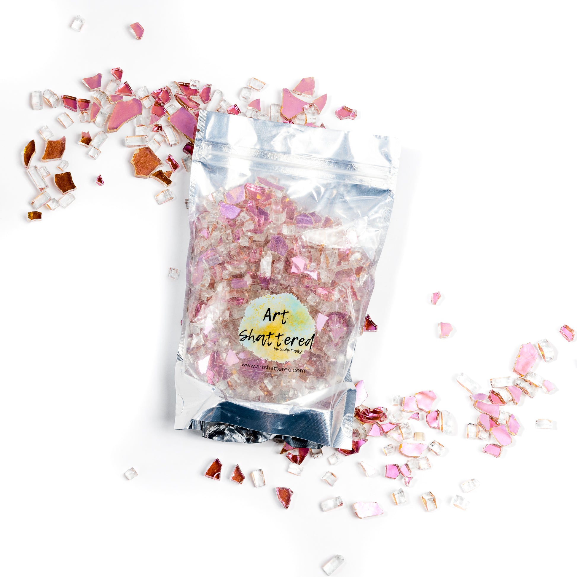 Add a luxurious touch to your art with our 1/4" Rose Gold Reflective Crushed Tempered Glass. This beautiful crushed glass features a captivating combination of rose pink hues with a shimmering gold reflective backing. The reflective quality of the gold backing adds a glamorous, radiant effect to your resin art, mixed media, and home décor projects, enhancing light play and bringing a sophisticated touch to your creations. The irregular crushed shapes provide a unique texture, making each piece a standout.