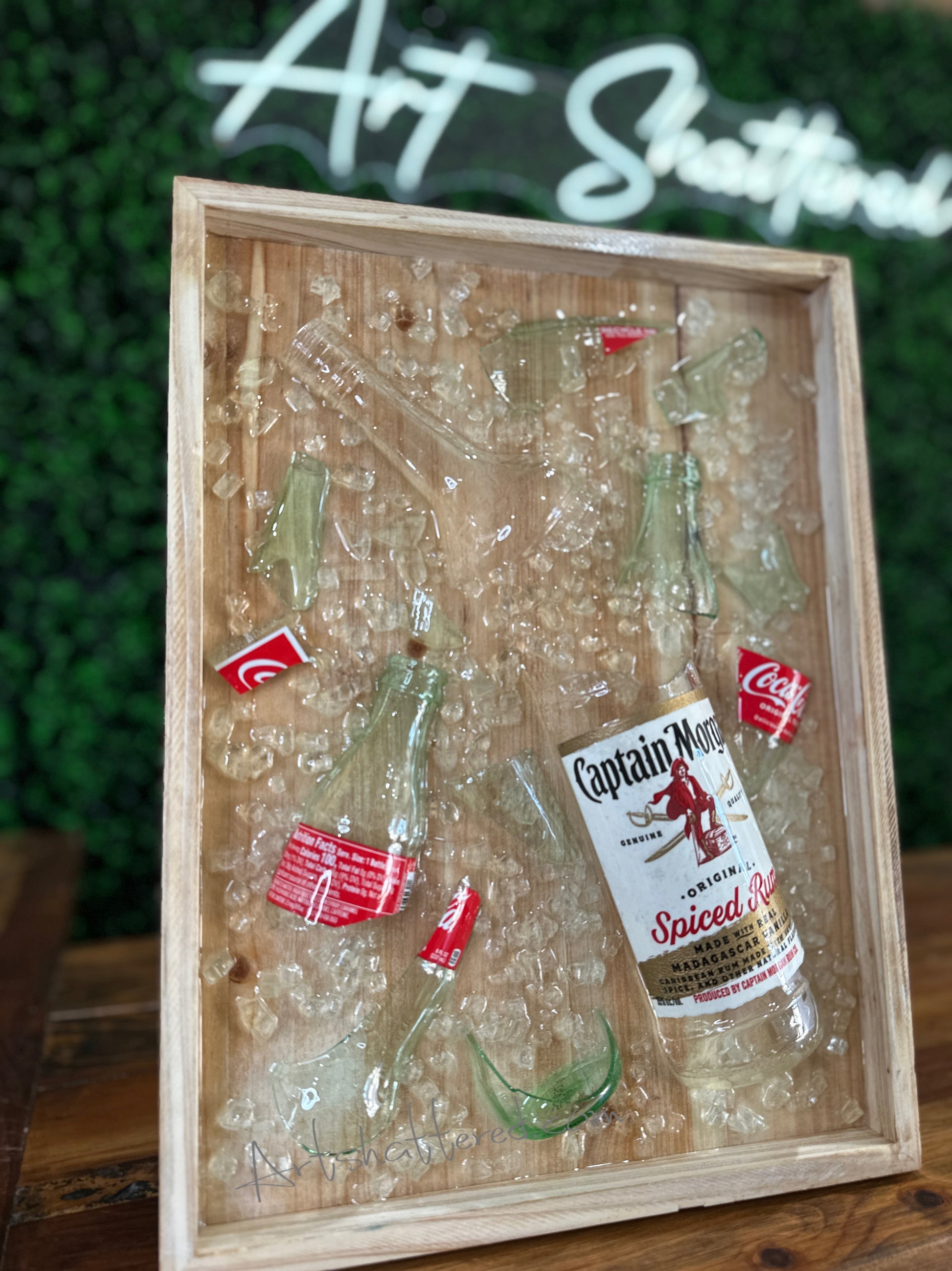Sassy, bold, and undeniably fun, Rum & Coke is a conversation-starting art piece that turns shattered bottles into a statement. Built on a 16x12-inch wood-framed panel, this artwork features real broken glass from a Captain Morgan rum bottle and a classic Coca-Cola bottle—scattered across a background of shimmering crushed glass and sealed in glossy resin.