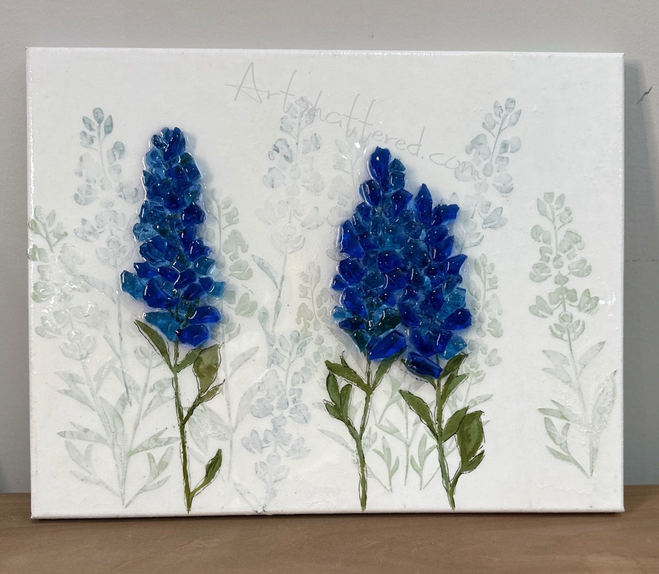 A tribute to Texas charm and wildflower beauty, Texas Bluebonnets is a textured, layered celebration of the Lone Star State’s most beloved bloom. Handcrafted on an 11x14-inch gallery-wrapped canvas, this piece features two bold bluebonnets made from deep cobalt blue crushed glass, nestled against a soft, multi-layered botanical background of pale green and white stenciled florals.